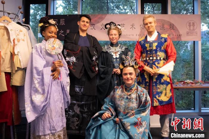 圖為德國學(xué)生身著漢服參與漢文化體驗課程,學(xué)習(xí)漢服文化。漢文化藝術(shù)交流中心供圖