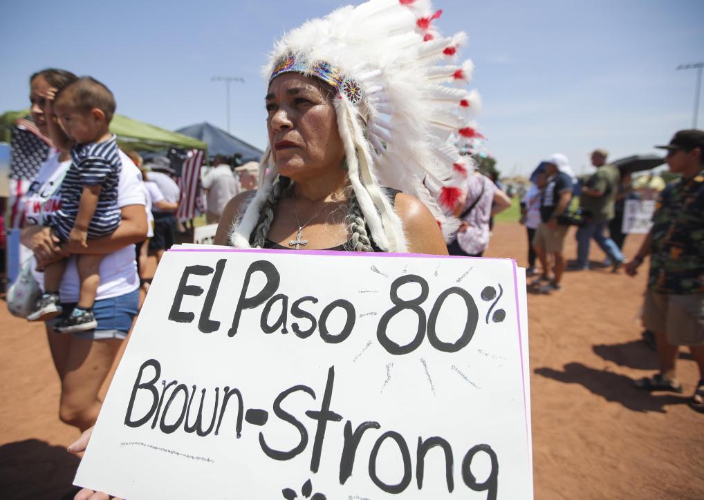 2019年8月7日,在美國得克薩斯州埃爾帕索市,印第安裔美國人普麗西拉·佩雷斯手舉標語參加反種族主義集會。新華社記者王迎攝
