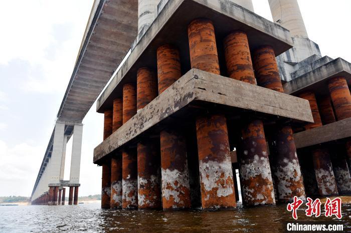 當?shù)貢r間10月18日,巴西北部,亞馬孫州首府馬瑙斯市的內(nèi)格羅河大橋因水位下降露出金屬橋墩。中新社記者 林春茵 攝
