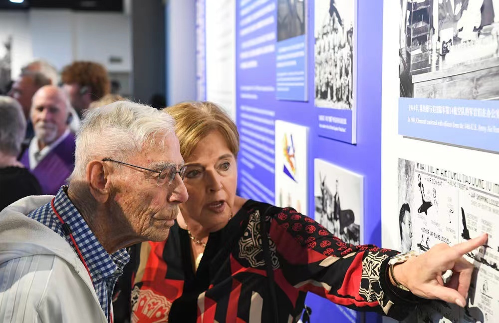 11月1日,在重慶史迪威博物館展廳,嘉蘭惠(右一)和飛虎隊老兵莫耶在重慶史迪威博物館參觀。新華社記者 王全超 攝