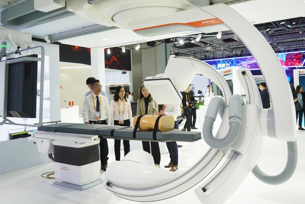 11月5日,在第六屆進(jìn)博會醫(yī)療器械及醫(yī)藥保健展區(qū)西門子展臺拍攝的全球首款量子能譜血管造影系統(tǒng)。新華社記者 金皓原 攝
