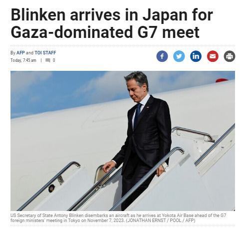 中新網(wǎng)11月7日電 據(jù)《以色列時(shí)報(bào)》報(bào)道,當(dāng)?shù)貢r(shí)間7日,美國國務(wù)卿布林肯已抵達(dá)日本,將在東京參加七國集團(tuán)(G7)外長會(huì)議。