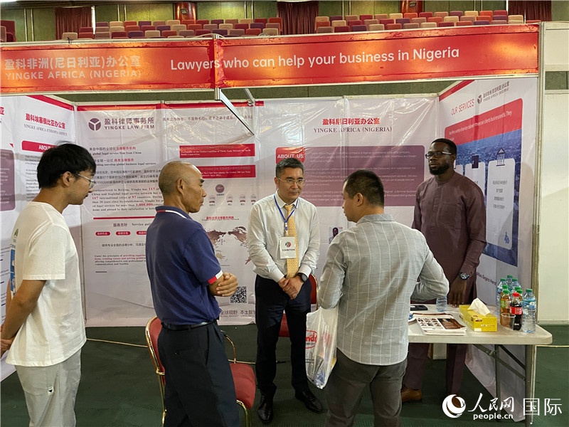 | 盈科非洲(尼日利亞)咨詢公司總經(jīng)理王振棟(左三)向客戶介紹業(yè)務(wù)。人民網(wǎng)記者 姜宣攝 |