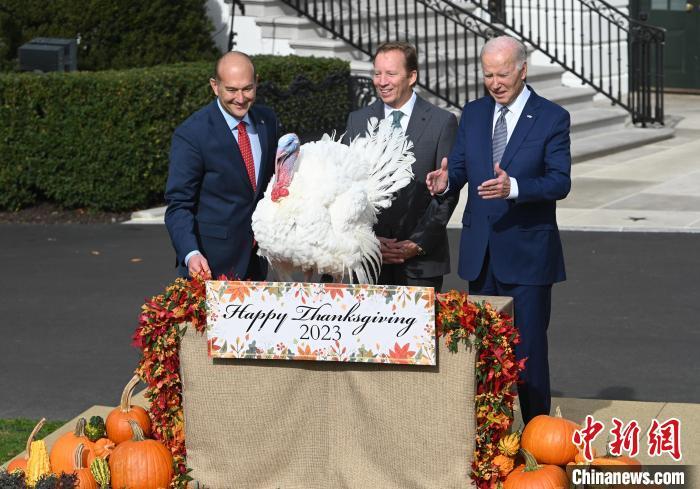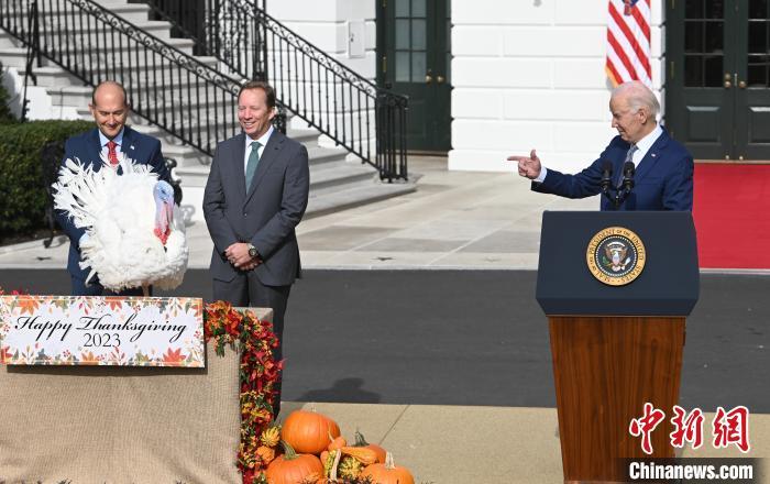 當(dāng)?shù)貢r(shí)間11月20日,華盛頓,美國(guó)總統(tǒng)拜登在白宮“赦免”感恩節(jié)幸運(yùn)火雞。 中新社記者 陳孟統(tǒng) 攝