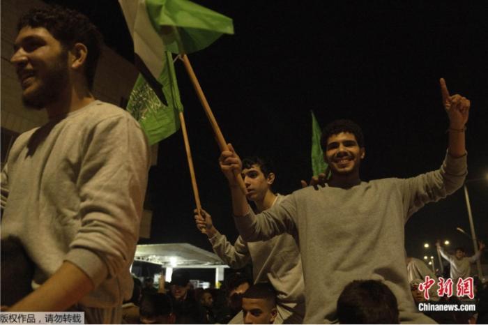 當(dāng)?shù)貢r(shí)間2023年11月24日,以色列釋放的39名巴勒斯坦人抵達(dá)約旦河西岸的貝圖尼亞市。