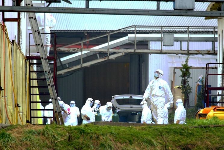 2004年2月29日,日本防疫人員在發(fā)生禽流感的京都府丹波町的養(yǎng)雞場(chǎng)內(nèi)準(zhǔn)備撲殺活雞。新華社記者馮武勇攝