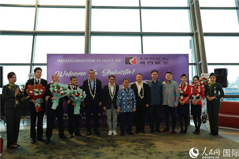 澳門航空首班澳門飛抵雅加達(dá)航班歡迎儀式嘉賓合影。人民網(wǎng)記者 曹師韻攝