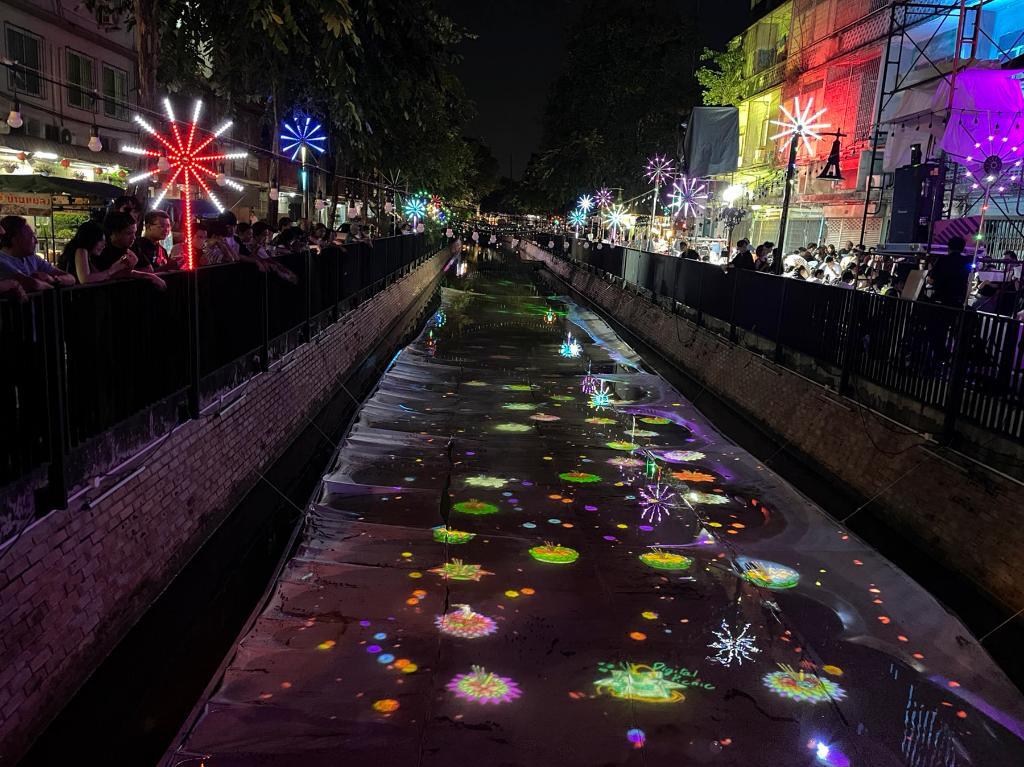 11月27日,色彩斑瀾的數(shù)字水燈投影到曼谷老城區(qū)翁昂運河上。新華社記者陳家寶攝