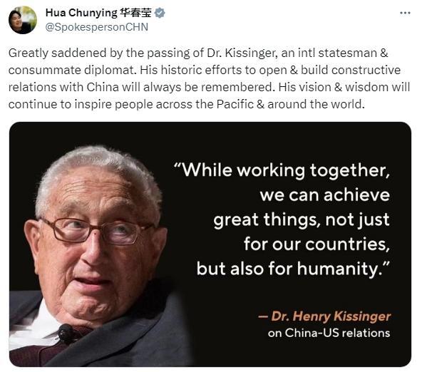 華春瑩寫道,“我對(duì)基辛格博士的逝世深感悲痛,他是一位國際政治家和杰出的外交家。我們將永遠(yuǎn)銘記他為開拓和建立同中國的建設(shè)性關(guān)系所作的歷史性努力。他的遠(yuǎn)見和智慧將繼續(xù)激勵(lì)太平洋地區(qū)乃至世界各地的人們。”