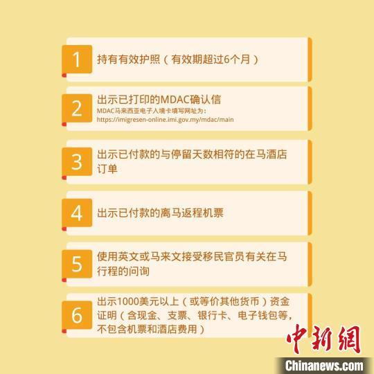 使館亦提醒,除了MDAC確認(rèn)信外,中國(guó)公民入境馬來(lái)西亞仍需持有有效期超過(guò)6個(gè)月的護(hù)照,出示已付款的、與停留天數(shù)相吻合的在馬酒店訂單,出示已付款的離馬返程機(jī)票,使用英文或馬來(lái)文接受移民官員關(guān)于在馬行程詢(xún)問(wèn),出示1000美元(或等價(jià)其他貨幣)以上資金證明(含現(xiàn)金、支票、銀行卡、電子錢(qián)包等,不含機(jī)票和酒店費(fèi)用)等。