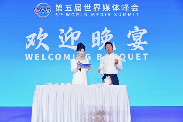 12月2日晚,歌手、電影人、鋒味品牌創(chuàng)始人謝霆鋒(右一)受邀參加第五屆世界媒體峰會(huì)歡迎晚宴,以代表中國(guó)香港茶餐廳美食文化的港式鴛鴦獻(xiàn)禮,與參會(huì)的450余名代表交流中華美食。(活動(dòng)主辦方供圖)