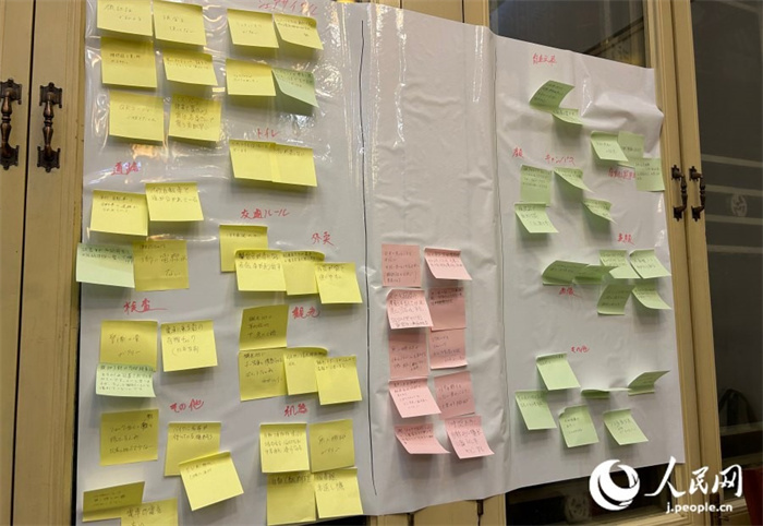 | 各組學(xué)生將關(guān)注的話題寫(xiě)在便利貼上,由此展開(kāi)探討。人民網(wǎng) 玄番登史江攝 |