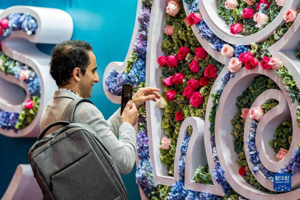 12月5日,在云南昆明參加第五屆世界媒體峰會(云南分會場)暨第二屆大象國際傳播論壇的參會代表拍攝展出的鮮花墻。