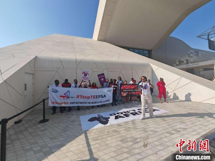 12月10日,阿聯(lián)酋迪拜,來(lái)自非洲的抗議者在COP28期間呼吁保護(hù)海洋環(huán)境、應(yīng)對(duì)氣候變化,反對(duì)在非洲使用化石燃料。 中新社記者 龐無(wú)忌 攝