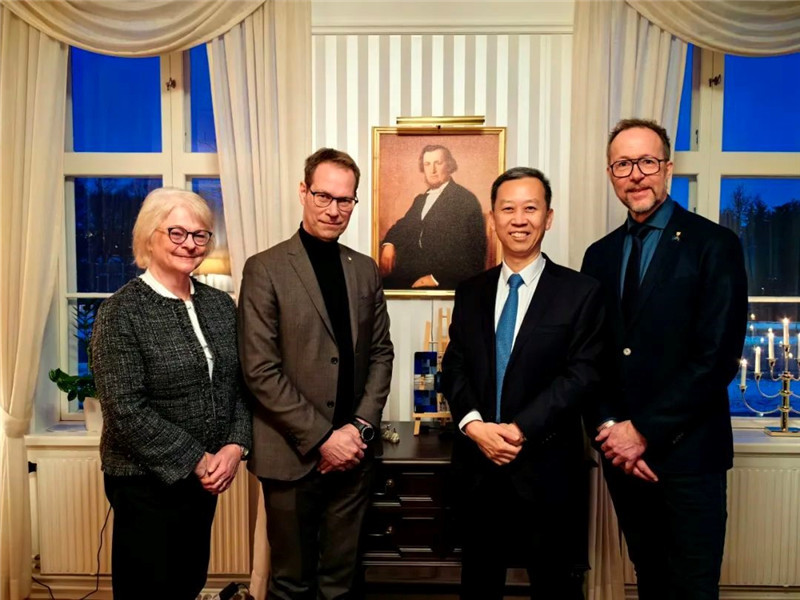 中國駐瑞典大使崔愛民(右二)會(huì)見瑞典林雪平市市長(zhǎng)桑弗里德松。中國駐瑞典大使館供圖