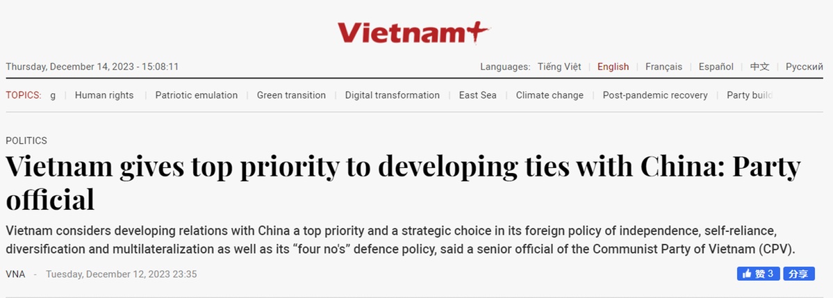 中國(guó)日?qǐng)?bào)網(wǎng)12月14日電 12月12日,中國(guó)和越南共同宣布中越兩黨兩國(guó)關(guān)系新定位,在深化中越全面戰(zhàn)略合作伙伴關(guān)系基礎(chǔ)上,攜手構(gòu)建具有戰(zhàn)略意義的中越命運(yùn)共同體。國(guó)際媒體對(duì)中越關(guān)系新定位進(jìn)行了密集報(bào)道,認(rèn)為雙邊關(guān)系更加重要,中越兩黨兩國(guó)關(guān)系邁上新臺(tái)階。