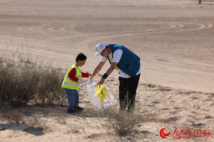 | 中方志愿者在撿拾沙漠中的垃圾。人民網(wǎng)記者 張志文攝 |