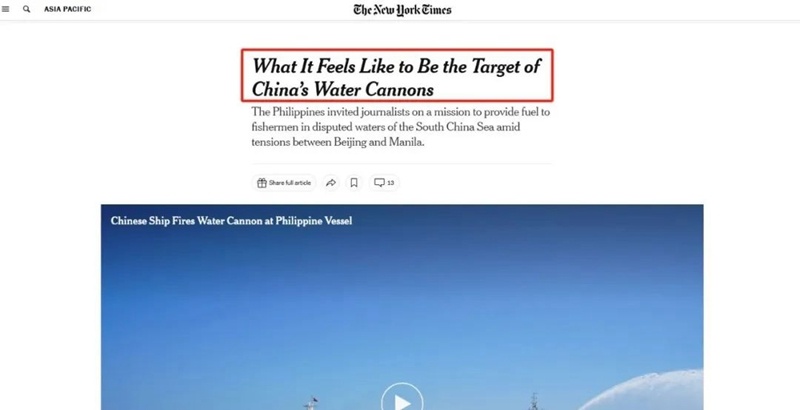 事件發(fā)生后,《紐約時(shí)報(bào)》也按計(jì)劃“交差”,刊發(fā)文章“力挺”菲方,試圖把中方塑造成“霸凌者”,在國際輿論上為菲方博取更多同情,向中方施加更大壓力。