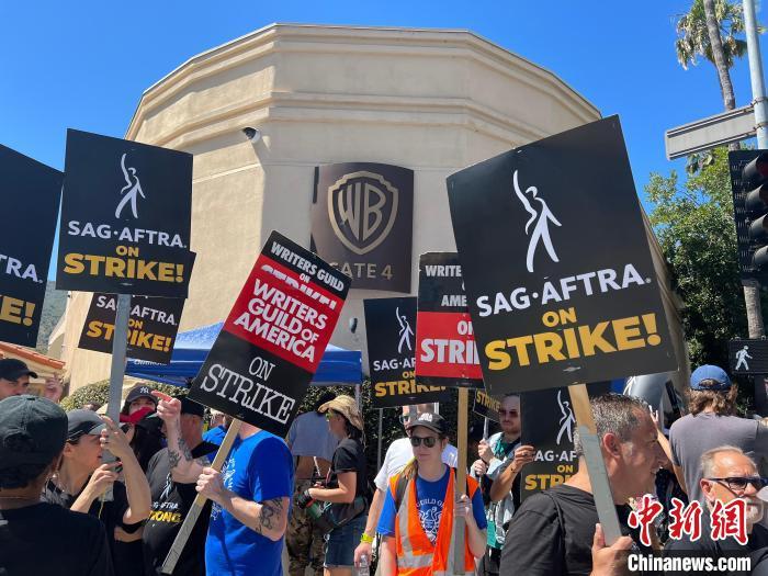 當(dāng)?shù)貢r(shí)間7月14日上午,華納兄弟、迪士尼等美國(guó)影視娛樂產(chǎn)業(yè)巨頭總部門前,有成百上千的人高舉“罷工”標(biāo)語牌游行示威。 中新社記者 張朔 攝