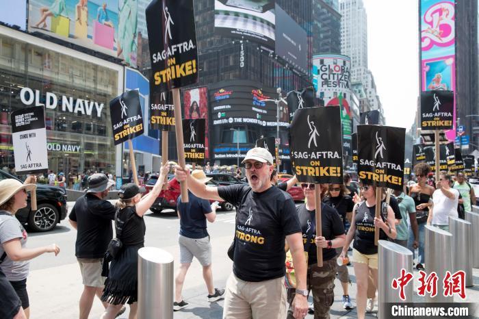 當(dāng)?shù)貢r(shí)間7月17日,美國(guó)紐約時(shí)報(bào)廣場(chǎng)派拉蒙影業(yè)公司門前,人們高舉“罷工”標(biāo)語牌游行示威。中新社記者 廖攀 攝
