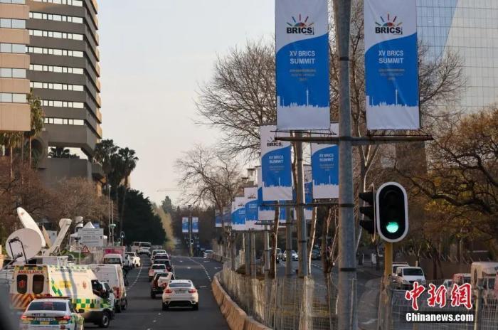 當地時間2023年8月20日,南非約翰內斯堡大街上懸掛著金磚峰會條幅。中新社記者 盛佳鵬 攝