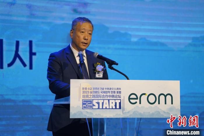 圖為韓中絲綢之路國際交流協(xié)會會長李先虎致辭。中新社記者 劉旭 攝