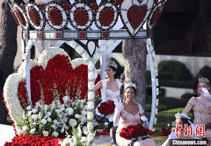 當(dāng)?shù)貢r(shí)間1月1日上午,第135屆美國(guó)玫瑰花車游行在加利福尼亞州歷史文化名城帕薩迪納市舉行。圖為2024年度“玫瑰皇后和玫瑰公主”花車?!≈行律缬浾?張朔 攝