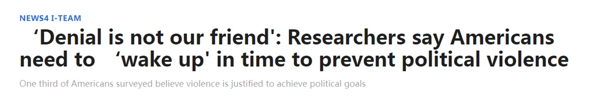 研究人員調(diào)查了超過8600名美國人對政治暴力的支持和意愿。結(jié)果顯示,在研究人員提供的17種情境中,1/3的受訪者認(rèn)為暴力通?;蚩偸窃谥辽僖环N情境下是合理的。18.7%的受訪者甚至強(qiáng)烈或極為強(qiáng)烈地認(rèn)為,“如果選舉出來的政治領(lǐng)導(dǎo)者無法保護(hù)美式民主,民眾就必須自己采取行動(dòng),即便需要使用暴力”。