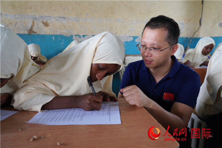 | 中國專家在指導(dǎo)學(xué)生填寫調(diào)查問卷。人民網(wǎng)記者 黃煒鑫攝 |