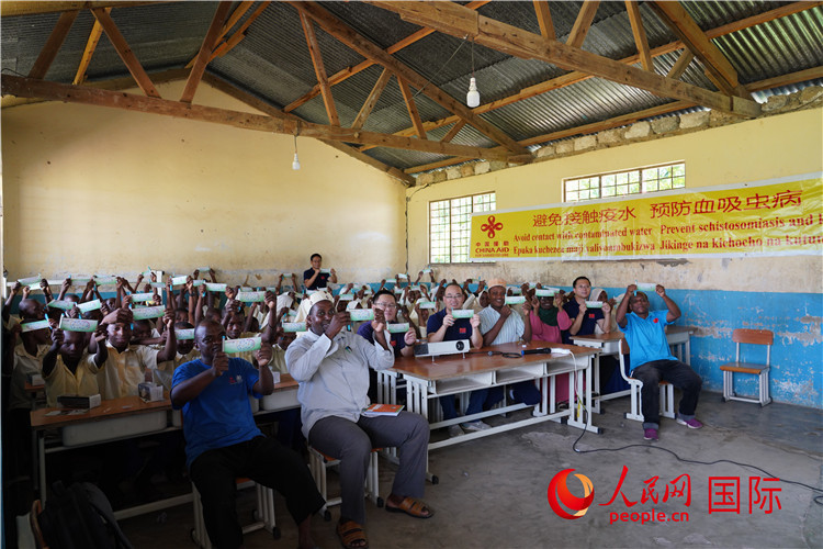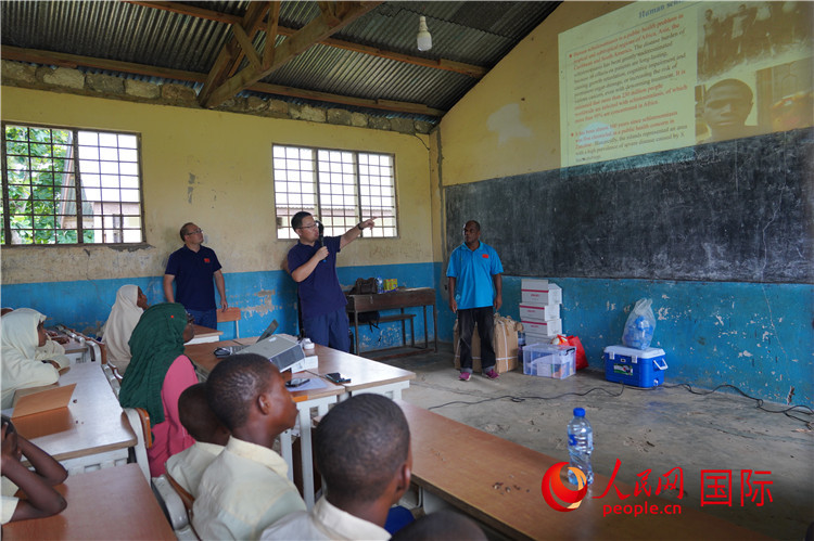 | 中國專家組走進(jìn)姆坦噶尼小學(xué)開展血吸蟲病防治健康教育。人民網(wǎng)記者 黃煒鑫攝 |