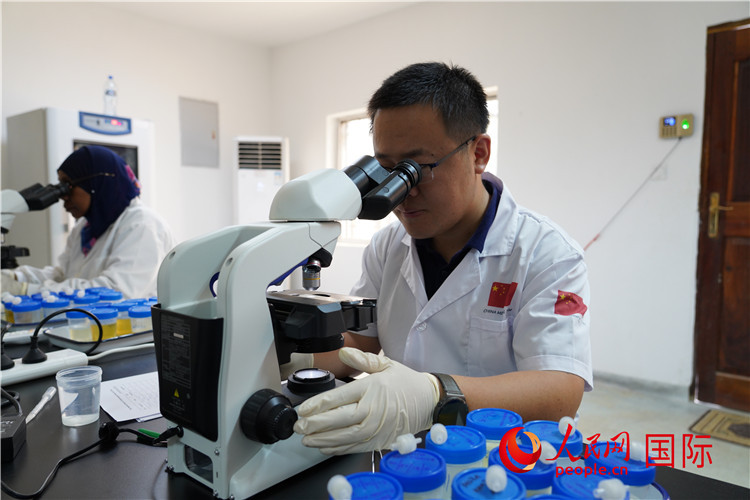 | 中國專家?guī)ьI(lǐng)實(shí)驗室人員檢驗?zāi)蛞簶颖?。人民網(wǎng)記者 黃煒鑫攝 |