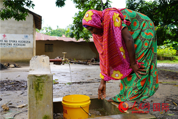 | 一名村民從中國專家組捐建的供水設(shè)施中取水。人民網(wǎng)記者 黃煒鑫攝 |