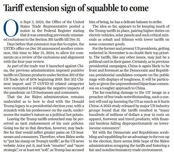 2018年,當時的特朗普政府以“國家安全”之名援引“301條款”(美國《1974年貿(mào)易法》第301條),對中國輸美商品加征懲罰性關(guān)稅。曾經(jīng)嚴厲抨擊特朗普關(guān)稅政策的拜登上臺后,新瓶裝舊酒,換湯不換藥,大體保留了特朗普政府對中國商品加征的關(guān)稅。