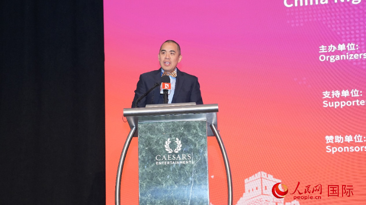 內(nèi)華達州副州長辦公室幕僚長魯?shù)稀づ撩鲌D安在論壇致辭。人民網(wǎng)記者 鄧圩攝