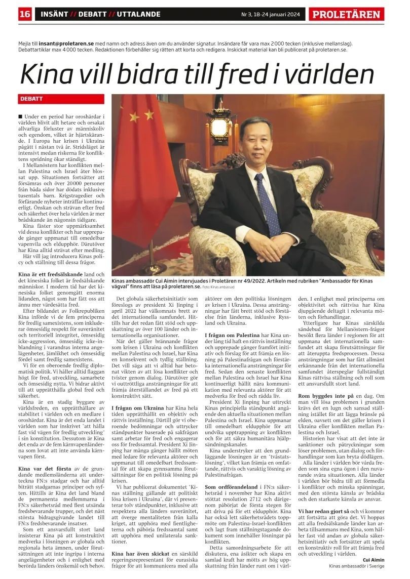 人民網(wǎng)斯德哥爾摩1月18日電 (記者殷淼)1月18日,中國駐瑞典大使崔愛民在瑞典《無產(chǎn)者報》發(fā)表題為《為世界和平發(fā)展貢獻中國力量》的署名文章,著重介紹中國在烏克蘭危機和巴以沖突等熱點問題上的政策和立場。崔愛民強調(diào)指出,“通過對話解決沖突和爭端,為恢復和平作出不懈努力,以自己的方式發(fā)揮建設(shè)性作用”是中方一貫堅持的明確立場。崔表示,希望所有愛好和平的國家同中方一道,秉持全球安全倡議精神,為促進地區(qū)和平與發(fā)展繼續(xù)發(fā)揮建設(shè)性作用。全文如下: