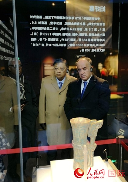 | 非洲駐華使節(jié)在參觀古代文物展品。人民網(wǎng)記者 李琰攝 |