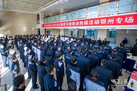 荊楚網(wǎng)(湖北日?qǐng)?bào)網(wǎng))訊(通訊員 王廳 張宏斌)迎春納福送春聯(lián),翰墨飄香暖警心。1月23日上午,省廳政治部、湖北公安文聯(lián)組織全省公安機(jī)關(guān)書法藝術(shù)家走進(jìn)鄂州市公安局,開展寫春聯(lián)送祝?;顒?dòng)。