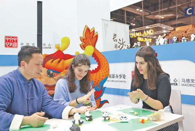 在中國(guó)展臺(tái),來(lái)自湖南的金杵面塑手藝人正在教觀眾基本的面塑技藝,制作大熊貓?jiān)煨偷募o(jì)念品。本報(bào)記者 顏歡攝