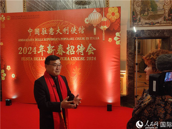 中國駐意大使賈桂德接受當(dāng)?shù)孛襟w采訪,為中意關(guān)系發(fā)展送上祝福。人民網(wǎng)記者 鄭彬攝