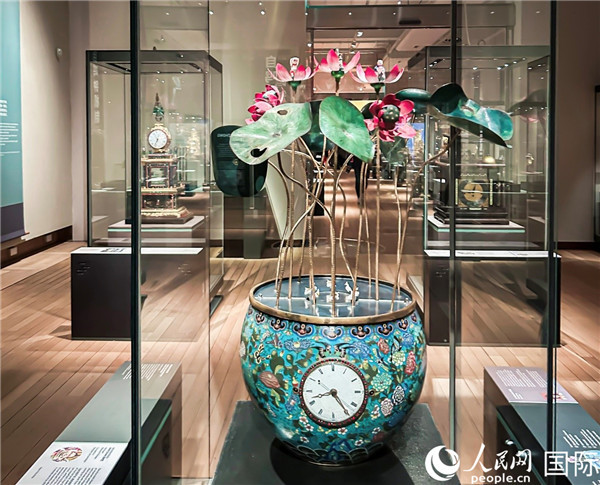 “我個(gè)人最喜歡的是銅鍍金鄉(xiāng)村景色水法鐘?!北敬握褂[的策展人、英國(guó)科學(xué)博物館科學(xué)收藏管理員簡(jiǎn)·德斯伯勒說(shuō),這件鐘表曾出現(xiàn)在紀(jì)錄片《我在故宮修文物》中,紡車、母雞、湖水、帆船……組成了一幅英國(guó)田園微縮景觀,是世界上極其少見的復(fù)雜鐘表之一。此次展出的另一個(gè)亮點(diǎn)為銅鍍金嵌琺瑯轉(zhuǎn)鴨荷花缸鐘。據(jù)介紹,此鐘由清宮造辦處工匠用廣州制作的掐絲琺瑯缸和法國(guó)的奏樂機(jī)械系統(tǒng)裝配而成?;ǖy鋪滿荷花缸腹部,一片荷塘從中伸出,其中三朵荷花可開合,花心中分別端坐西王母、持桃童子、持桃仙猿,充滿了美好的寓意。
