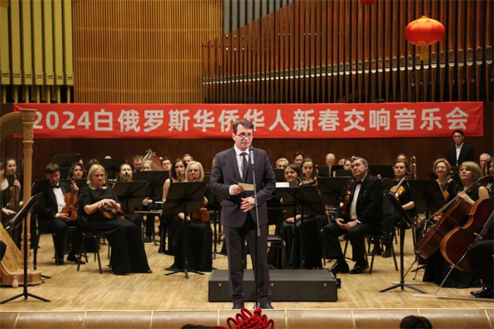 格羅馬達(dá)第一副部長(zhǎng)在致辭中首先向在場(chǎng)的中國(guó)朋友以及全體中國(guó)人民致以美好的新春祝福并表示,盡管白俄羅斯與中國(guó)相隔萬(wàn)里,兩國(guó)仍建立了緊密且高效的協(xié)作關(guān)系。中白文化領(lǐng)域合作是兩國(guó)關(guān)系中重要的組成部分。“歡樂(lè)春節(jié)”框架下的大規(guī)模慶?;顒?dòng)已多年在白舉辦并成為良好傳統(tǒng)。包括今晚的華僑華人交響音樂(lè)會(huì)在內(nèi)的慶祝中國(guó)春節(jié)的活動(dòng)讓白民眾更好地了解中國(guó)及其節(jié)日文化,使兩國(guó)民眾的距離更為親近。談到中國(guó),總是令人想起古老又富有教育意義的璀璨歷史。中國(guó)享譽(yù)世界的眾多名勝古跡蘊(yùn)含著中國(guó)人民驚人的創(chuàng)造力和深邃的中國(guó)智慧。2024年是中國(guó)龍年,也是白俄羅斯“質(zhì)量年”。相信在這一特殊年份,雙方將更加積極地實(shí)施植根于兩國(guó)優(yōu)秀傳統(tǒng)價(jià)值觀的聯(lián)合文化創(chuàng)意項(xiàng)目。祝中國(guó)朋友新的一年里身體健康、諸事順?biāo)臁?guó)泰民安、春節(jié)快樂(lè)。