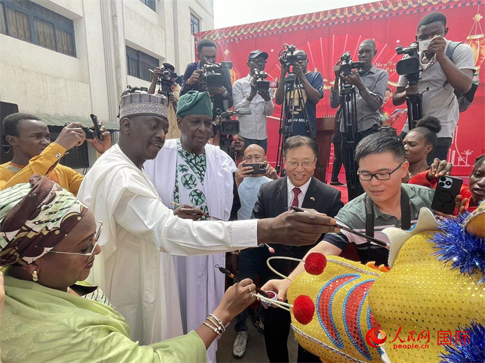 駐尼日利亞使館領(lǐng)導(dǎo)與尼方官員一起為祥龍“點睛”。人民網(wǎng)記者 姜宣攝