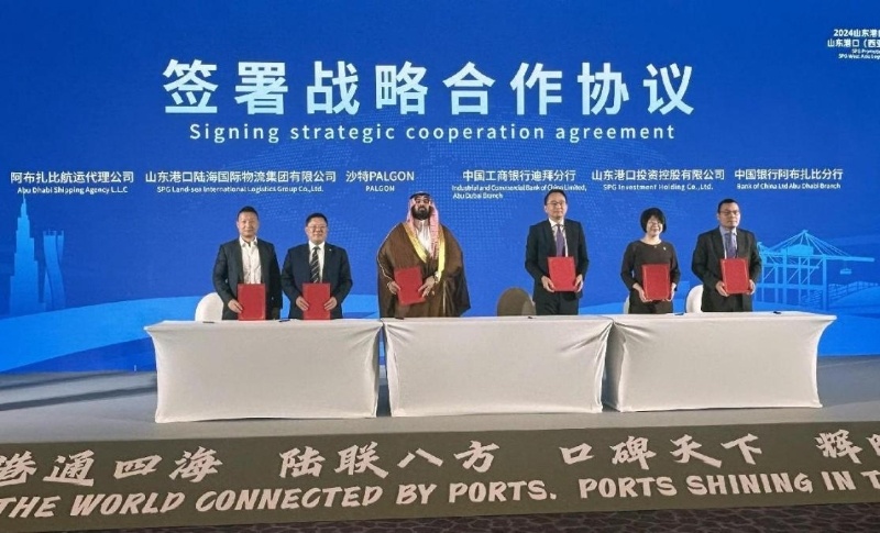 當(dāng)天活動上,山東港口集團(tuán)多家機(jī)構(gòu)進(jìn)行了業(yè)務(wù)推介。來自中國、阿聯(lián)酋、沙特等國的企業(yè)簽署了戰(zhàn)略合作協(xié)議。