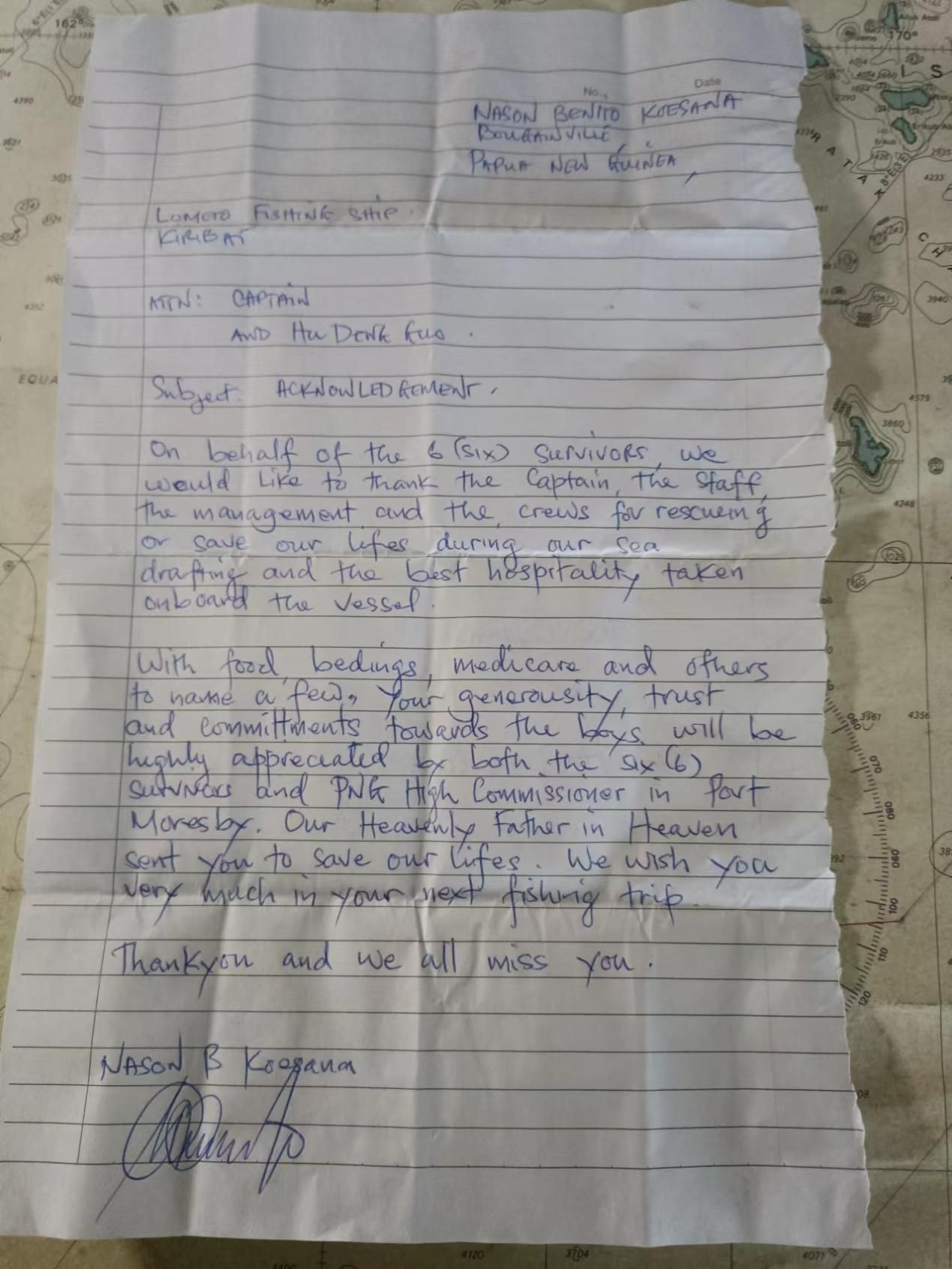 內(nèi)森·本特羅·科埃薩納代表被救的全體6名巴新遇險(xiǎn)人員,專門寫了感謝信,向中國(guó)漁船船長(zhǎng)及船員表示感謝。感謝信寫道:“當(dāng)我們?cè)诤I掀鲿r(shí),船長(zhǎng)和船員拯救了我們的生命,我們?cè)诖鲜艿搅俗詈玫目畲?。(中?guó)漁船給我們提供了)食物、床上用品、醫(yī)療救助等,我們6名幸存者及莫爾茲比港的巴新高級(jí)專員都高度贊賞你們對(duì)我們的慷慨、信任和奉獻(xiàn)?!?/p>