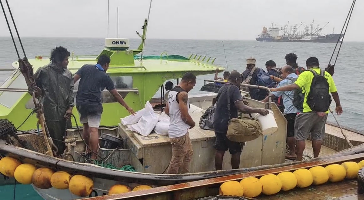 6名巴新遇險(xiǎn)人員被中國(guó)漁船船員解救后,登上小船進(jìn)入基里巴斯塔拉瓦港。