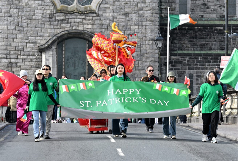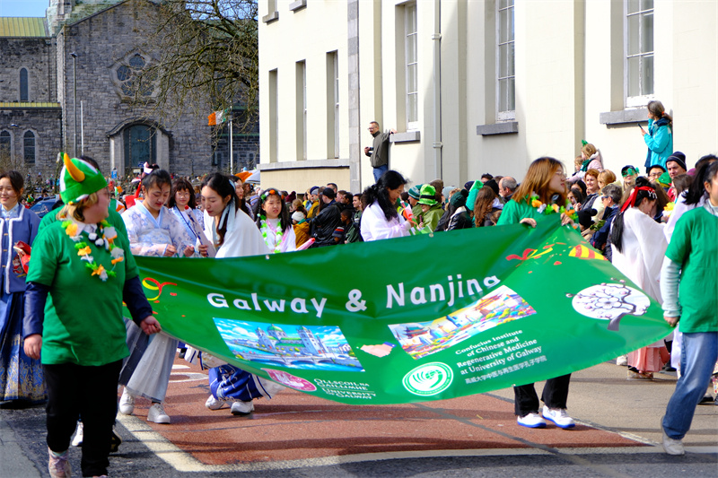 3月17日是愛爾蘭一年一度的圣帕特里克節(jié),高威大學(xué)孔子學(xué)院組建方隊(duì)加入了當(dāng)?shù)氐膽c祝行列展示中國傳統(tǒng)文化。高威大學(xué)孔子學(xué)院供圖