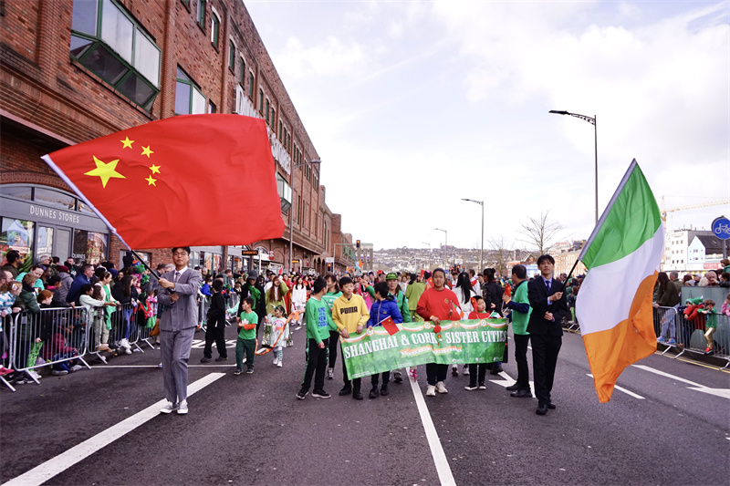 科克大學(xué)孔子學(xué)院組織的隊(duì)伍手持中愛兩國國旗,手拉科克與上海友好城市的橫幅。科克大學(xué)孔子學(xué)院供圖