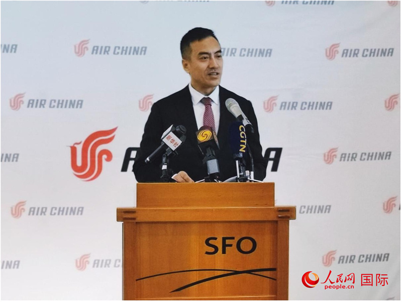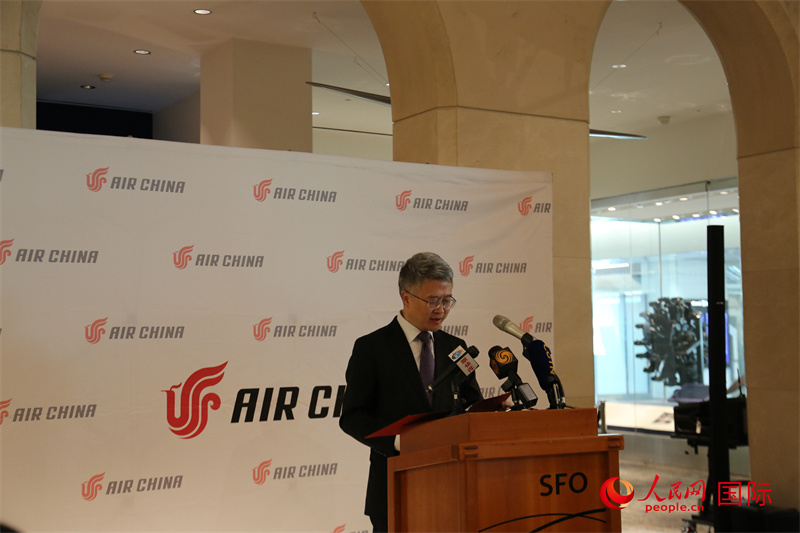 國(guó)航北美地區(qū)總部總經(jīng)理彭雷發(fā)表致辭。人民網(wǎng)記者 鄧圩攝