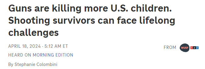 中國(guó)日?qǐng)?bào)網(wǎng)4月22日電 根據(jù)美國(guó)疾控中心的數(shù)據(jù),槍支已成為美國(guó)兒童和青少年的頭號(hào)死因。據(jù)估計(jì),槍擊事件的幸存兒童數(shù)量是死亡兒童數(shù)量的2到4倍,這些幸存兒童可能面臨終身的挑戰(zhàn),如殘疾、疼痛、心理創(chuàng)傷和經(jīng)濟(jì)負(fù)擔(dān)。