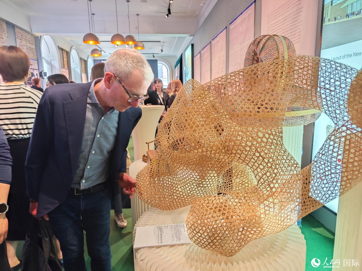 倫敦手工藝周主席蓋伊·索爾特在認(rèn)真欣賞竹編雕塑作品《石為云根》。人民網(wǎng)記者 邢雪攝
